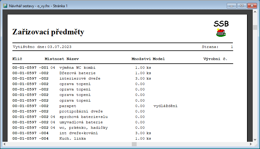 Úloha slouží k tisku zařizovacích předmětů objektů a všech údajů o plánované výměně.