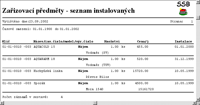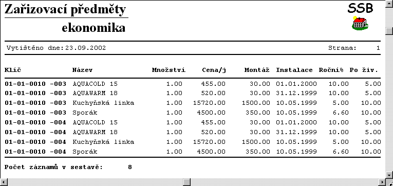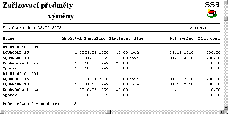 Úloha slouží k tisku zařizovacích předmětů objektů, jejich identifikace, množství a datumu instalace, vyřazení či plánované výměny.