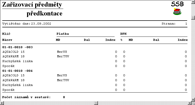 Voláno z menu: Sestavy ⇒ Objekty ⇒ Zařizovací předměty - předkontace