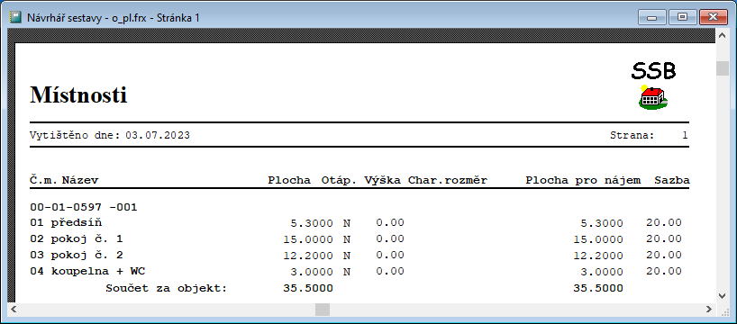 Úloha slouží k tisku jednotlivých místností, jejich rozměrů a sazby nájemného. Obsahuje součet za celek.
