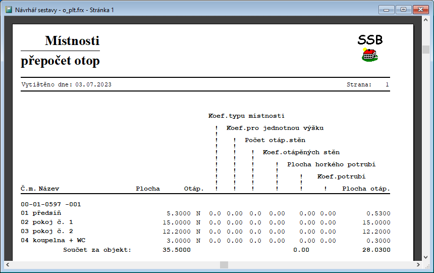 Úloha slouží k tisku jednotlivých místností, jejich rozměrů a dokumentace přepočtu otápěné plochy místností pomocí koeficientů.