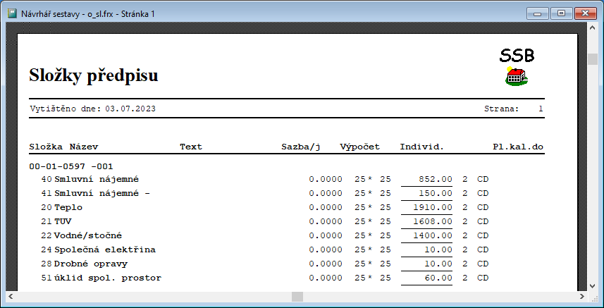Úloha tiskne pro každý objekt aktuální stav fondů oprav a tabulku jednotlivých rozpočítaných nákladů