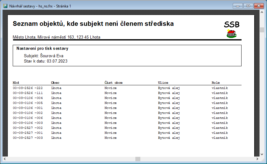 Voláno z menu: Sestavy ⇒ Objekty ⇒ Objekty, kde není subjekt členem střediska