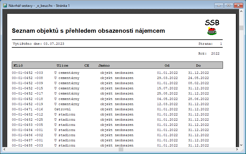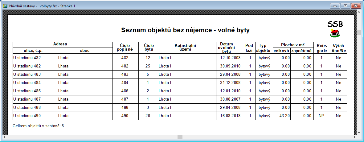 - Dle stavu ke dni - je-li k tomuto datu objekt bez nájemce a jsou splněny všechny ostatní podmínky, je objekt vytištěn