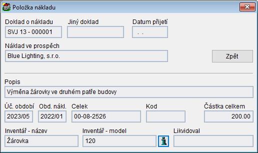 spouští Formulář Položka inventáře. Vazbu na inventář lze dále použít k vykazování vynaložených nákladů na jednotlivé druhy zařizovacích předmětů ap. - Bližší popis objednané práce a Dosažitelnost objednavatele - údaje, které se tisknou na požadavkový list pro potřebu opravu provádějícího pracovníka.