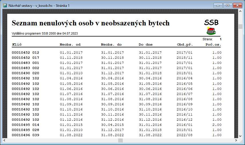 Úloha tiskne seznam objektů a měsíců, v nichž jsou objekty neobsazeny a přitom není počet osob 0. Slouží ke kontrole, převážně před vyúčtováním služeb. Za neobsazený objekt se považuje ten, v němž v určitý okamžik je určen vlastník a není nastěhován nájemce. Při kontrole se vychází z předpokladu, že se kontrolují objekty např. ve vlastnictví obce, které vlastník v naprosté většině sám objekt neužívá a tudíž chybí-li nájemce, je objekt zřejmě neobsazen.