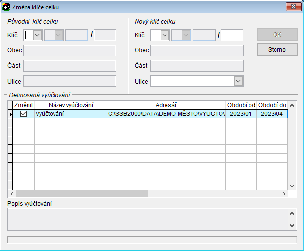 - Tabulka Definovaná vyúčtování - pokud pro „Původní klíč celku“ byla provedena nějaká vyúčtování služeb, jsou tato vyúčtování v tabulce zobrazena a je možno je označit ke zpracování (změně klíče celku ve všech souborech konkrétního vyúčtování) či nikoliv. Pokud do vyúčtování bude vstupováno z dat s novým klíčem celku, je vhodné vyúčtování označit a zpracovat.