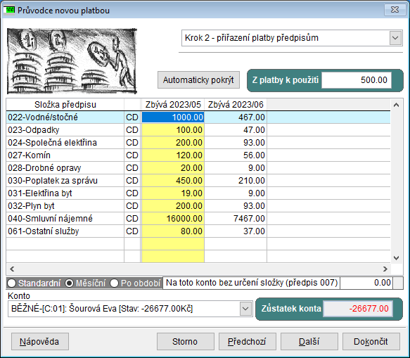 - automatické i ruční přiřazování plateb předpisům (v případě, že plátce uhradí pouze část měsíčního předpisu, lze nastavit priority pro automatické přiřazování, v jakém pořadí se mají složky předpisu uhradit - například nejprve nájem, poté záloha na teplo, poté záloha na vodu atd.). Při ručním přiřazování plateb můžete respektovat platební dispozici uvedenou plátcem (například: „… platím pouze nájem, služby ne, protože nesouhlasím s výší záloh …“)