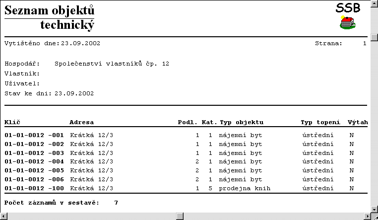 Program SSB 2000 je program pro správu bytů, nebytových prostor a jiných objektů bez ohledu na vlastnické vztahy. Je určen pro správu obecních, družstevních a podnikových bytů, bytů v osobním vlastnictví i libovolné kombinace těchto možností, a to i v rámci jednoho stavebního celku.