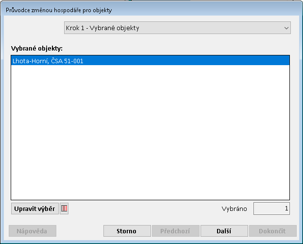 Spouští Průvodce změnou hospodáře pro celek. Slouží k hromadné změně hospodáře zpětně ve všech objektech celku. Používá se obvykle při prodeji celku či vzniku společenství vlastníků.