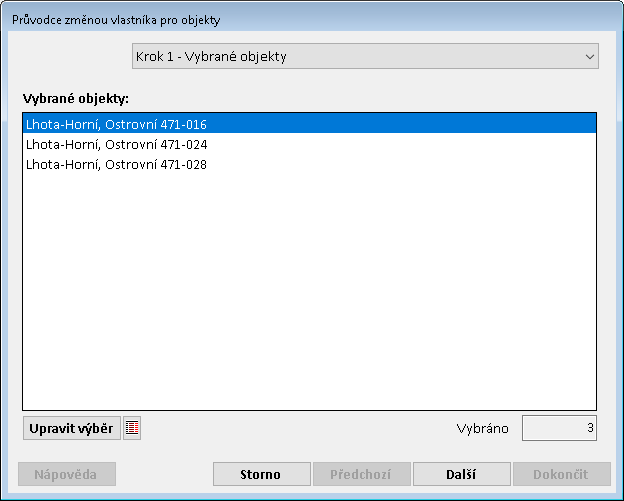 Spouští Průvodce - hromadné nastěhování nového vlastníka. Lze použít při novém pořízení celého celku a objektů, nebo při změně vlastnických vztahů.