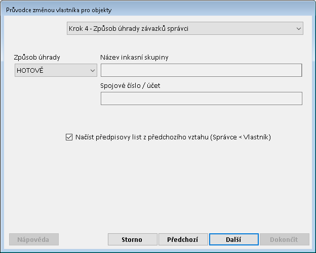 vybírá hospodář. Opět lze vytvořit nového hospodáře nebo vybrat ze seznamu. - Obrázek: Průvodce změnou hospodáře pro celek (Krok 4 - Způsob úhrady závazků správci)