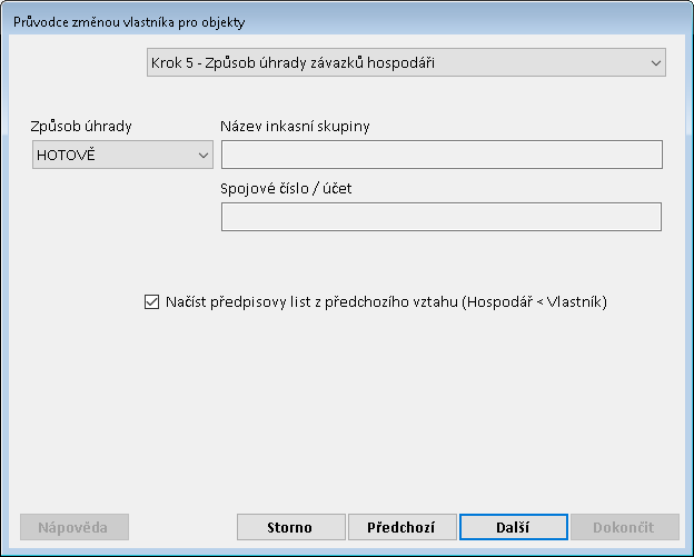 Ve čtvrtém kroku lze nastavit způsob úhrady závazků vůči správci. lze nastavit způsob penalizace a vázání nepřiřazených plateb (více v Formulář Definice konta). - Obrázek: Průvodce změnou hospodáře pro celek (Krok 5 - Dokončení)