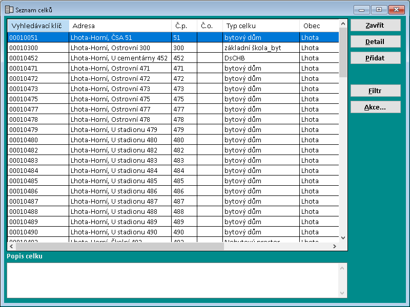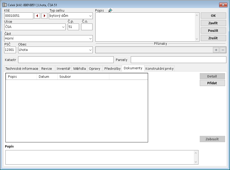 Voláno z menu: Běžné akce ⇒ Celky (domy ap.)