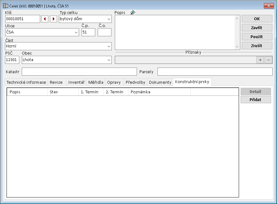 - Klíč určuje, který celek je zobrazen. Při pořizování nového záznamu je třeba klíč postupně vyplnit existujícím kódem obce a části a číslem popisným celku.