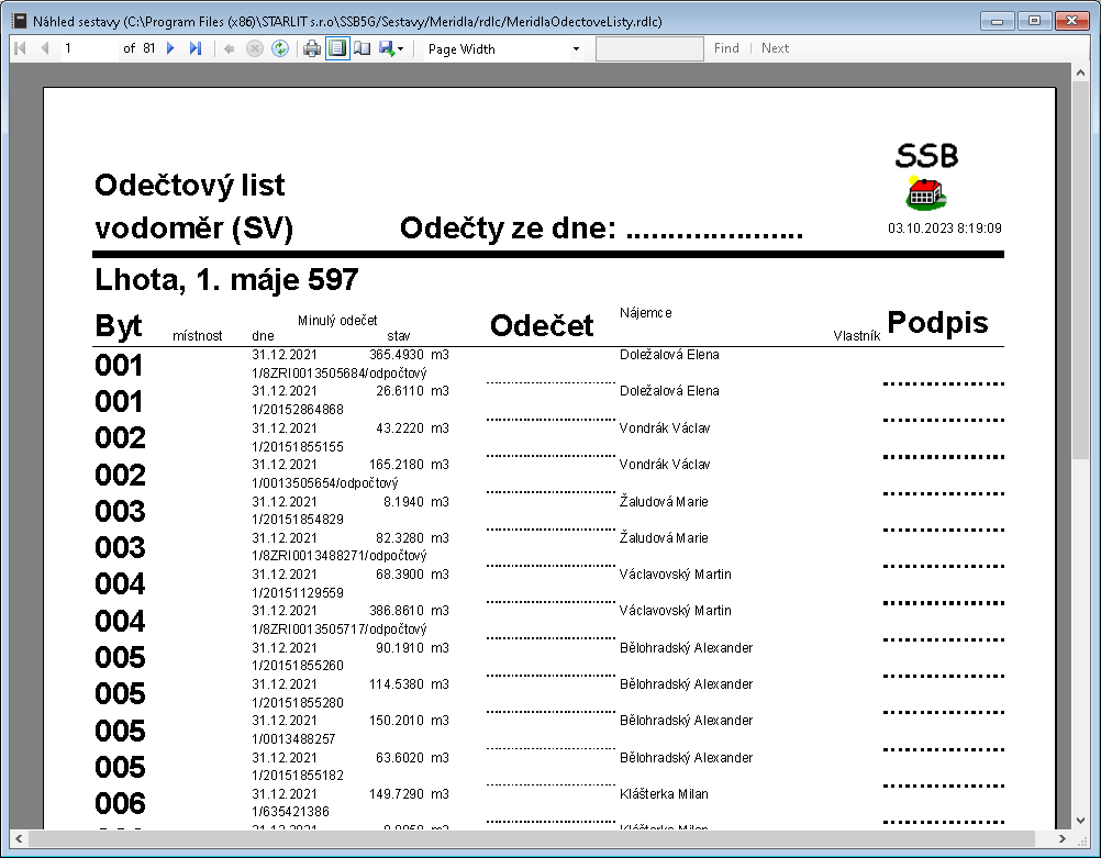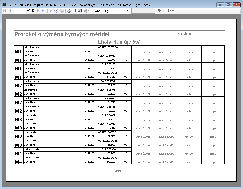 Obrázek: Příklad tiskové sestavy - Odečty měřidel souhrně