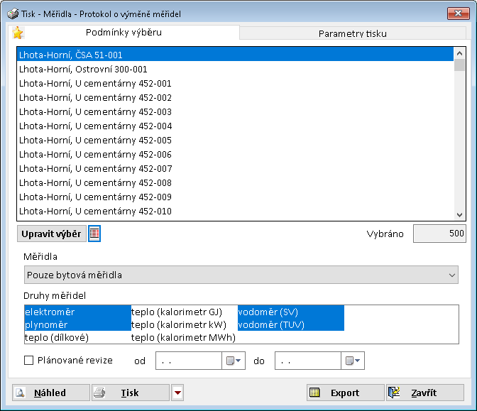 - Předvolby Bytová měřidla a Patní měřidla - určují, zda se budou tisknout jen bytová, patní, nebo oba typy.