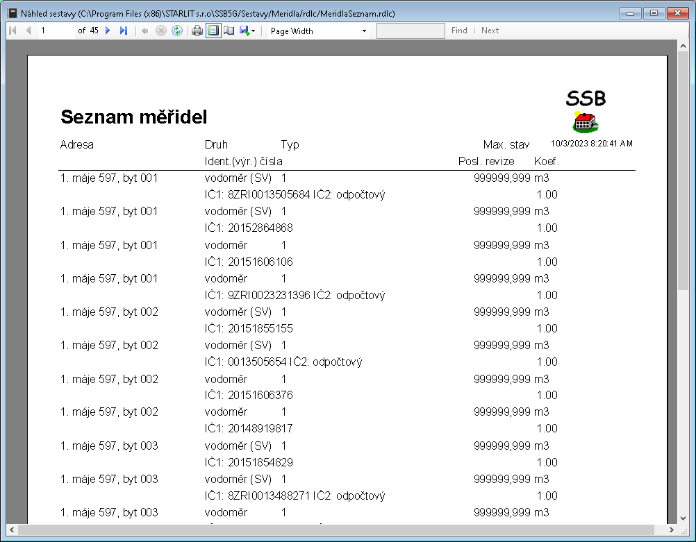 Úloha tiskne seznam měřidel dle evidence v Objekt - záložka Pasport včetně identifikace, umístění a posledního odečtu.