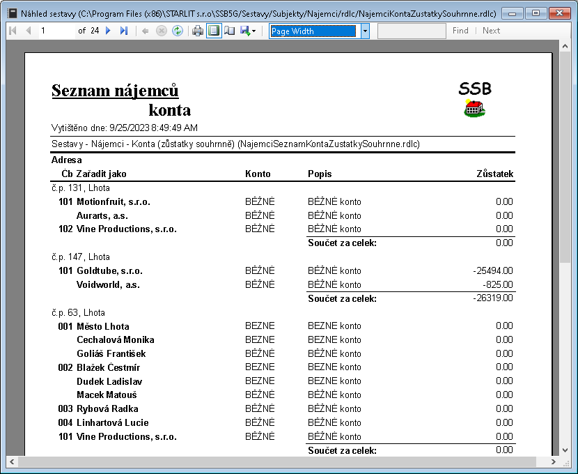 Úloha tiskne seznam nájemců, datum nastěhování a odstěhování a celkový zůstatek na saldu včetně všech předpisů a plateb (nájemné, penále, vyúčtování ap.), bez ohledu na konta a přiřazení plateb.