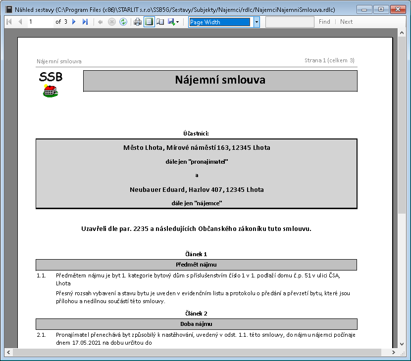 - Předvolba Rodné číslo - zapnutí způsobí tisk rodného čísla fyzické osoby (resp. IČO právnické osoby) nájemce, viz Formulář Kontakt.
