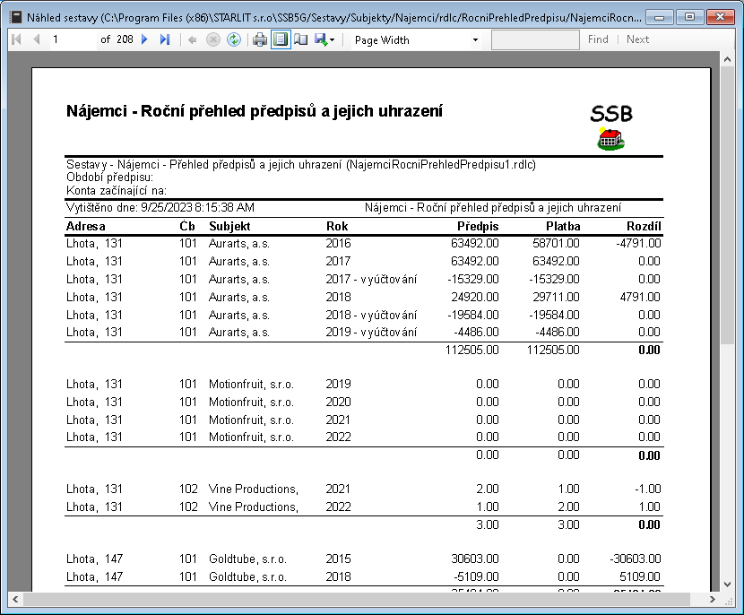 Úloha slouží k zobrazení seznamu subjektů (nájemců, vlastníků či hospodářů) s vyčíslenými zůstatky kumulovanými po jednotlivých kalendářních rocích. Předpisy jsou do výstupu zařazeny na základě zadaných omezujících podmínek, platby podle přiřazení k těmto předpisům.