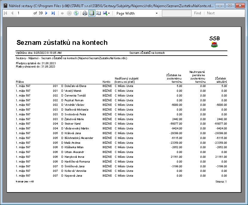 Úloha slouží k zobrazení seznamu kont vybraných subjektů včetně identifikace subjektu a konta, vůči komu je dluh (resp. přeplatek), zůstatek ke zvolenému datu, neuhrazené penále, zůstatek k dnešku a nepřiřazené platby.