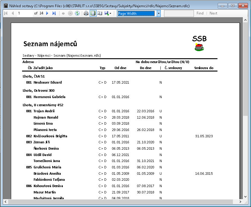 Úloha tiskne seznam nájemců spolu s daty nastěhování a odstěhování a čísla nájemní smlouvy.