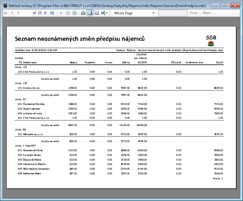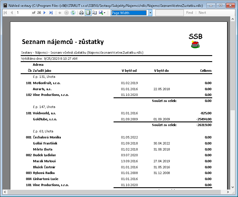 Úloha tiskne seznam spolubydlících osob zvolených subjektů, uvedených v Nájemce, Vlastník - záložka Spolubydlící.