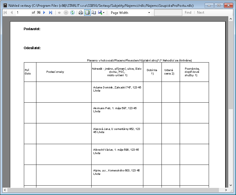 Obrázek: Formulář Tisk ( Nájemci - soupiska podání na poštu )