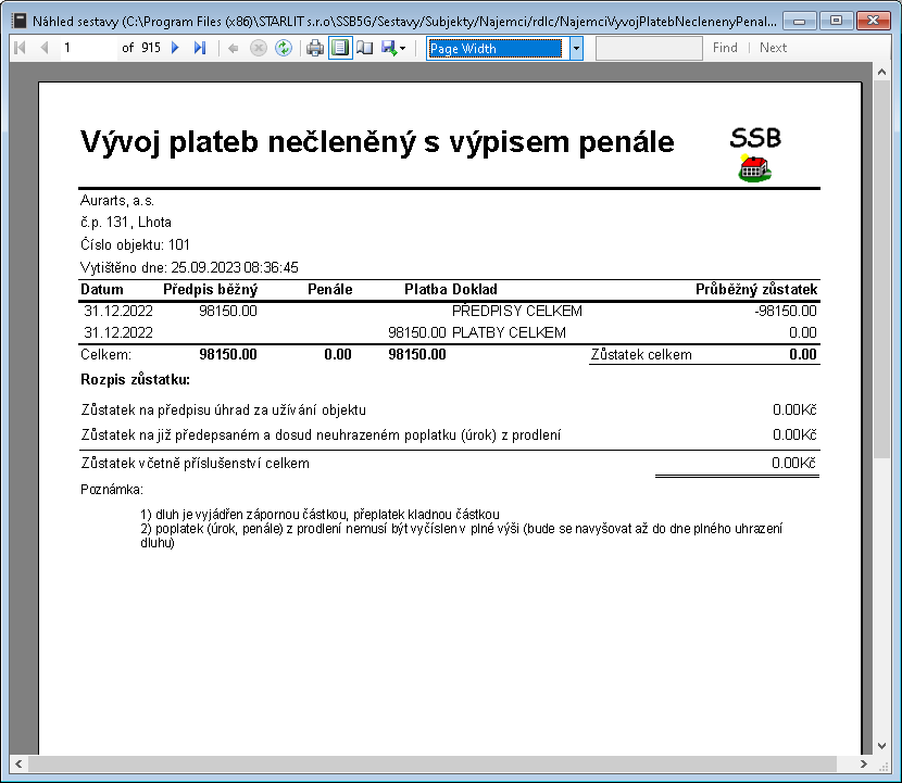 Voláno z menu: Sestavy ⇒ Nájemci ⇒ Vývoj plateb - nečleněný s výpisem penále