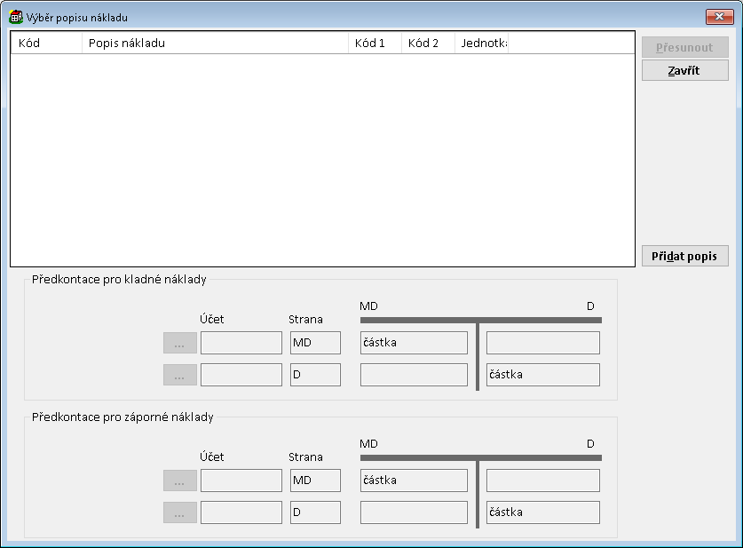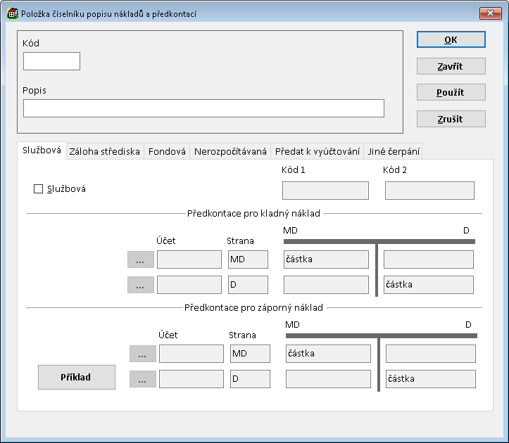 - kód 1 a kód 2 - údaje sloužící k dalšímu zpracovávání a vykazování nákladů.