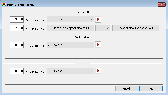 - Způsob rozúčtování - určuje, jak má být částka nákladu rozdělena mezi objekty. Je zde možno zadat rozúčtování 100% jen v jednom řádku, nebo rozúčtování základní a spotřební složky (jeden řádek a druhý řádek), např. 30% a 70%. V každém řádku dále následuje rozbalovací nabídka všech jednotek, definovaných v úloze Ukládané jednotky, rozbalovací nabídka matematických operátorů ( * | / | + | - ) a znovu rozbalovací nabídka všech jednotek.