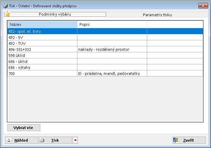 Úloha tiskne prostý seznam složek předpisu, definovaných v úloze Složky předpisu.