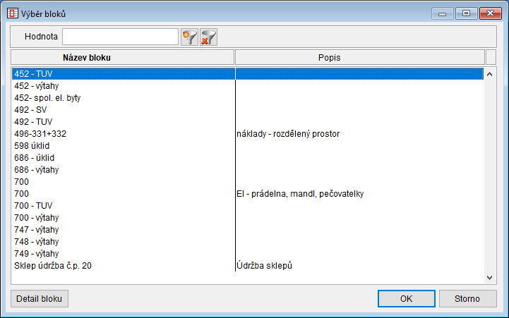 - Tabulka obsahuje po spuštění úplný seznam definovaných bloků. Některé bloky lze označit.
